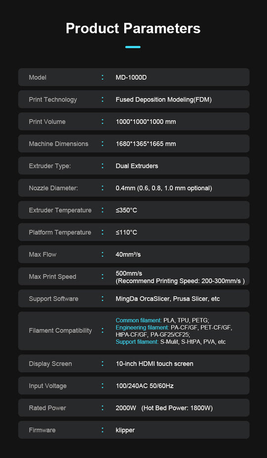 MINGDA MD-1000D FEATURES SPECIFICATIONS Resources MD-1000D User Manual About MINGDA Shenzhen MINGDA Technology Co., Ltd. is a high-tech enterprise focusing on 3D printing R&D and production. Founded in 2012, it is committed to providing large-scale industrial...Sale price $27,999.00Regular price $32,999.00Sale price $27,999.00Regular price $32,999.00 -